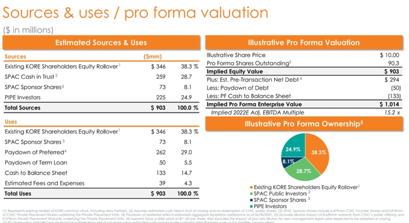 This expansion culminated in October 2021 with a SPAC merger through Cerberus Telecom Acquisition Corp, valuing KORE at $1 billion (15.2x FY’22E EBITDA). Koch Industries and BlackRock-managed funds led a $225 million PIPE investment, while Abry maintained a 38% stake.
