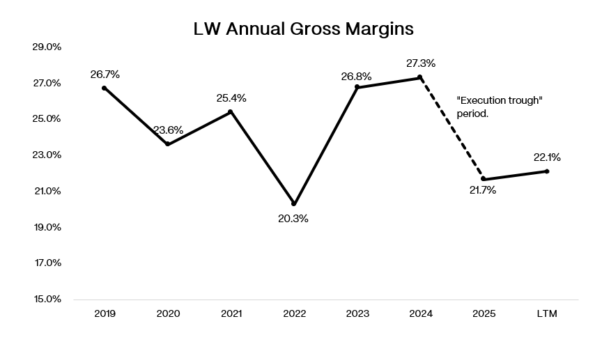 A messy ERP transition disrupted planning and fulfillment, a product recall hit the quality halo, and broader operational miscues impaired service levels. The commercial fallout was predictable, order fill/OTIF and quality issues caused customers to diversify or shift volume, and LW moved into win-back mode, leaning on commercial concessions to recover business while trying to rebuild retention and quality back toward historical norms.