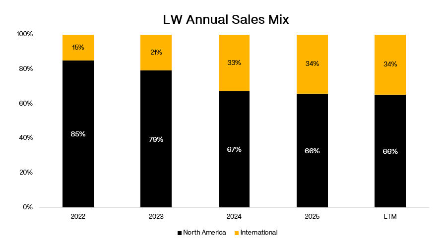 Lamb Weston is a frozen potato processor. Buy potatoes, turn them into fries, sell to QSRs, restaurant chains, foodservice distributors, retail. North America is 2/3rds of sales, international the rest.