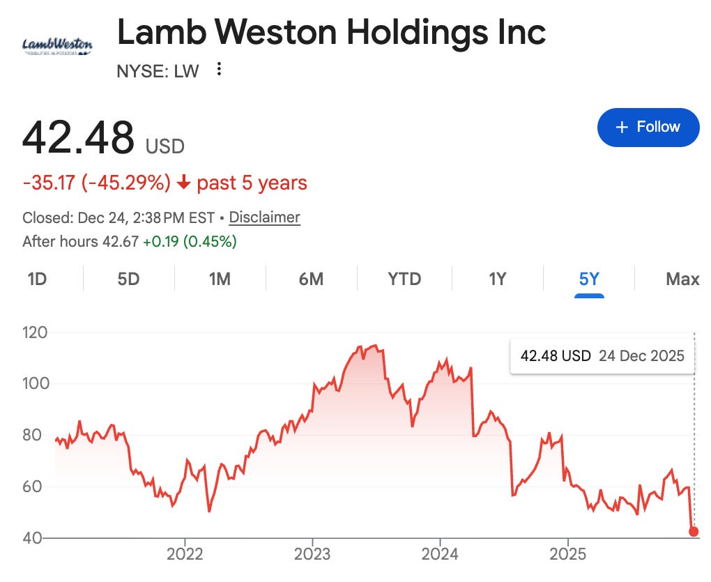 The business model is basically this: keep plants full, run them efficiently, manage potato and manufacturing costs, and maintain enough commercial leverage to price through inflation. North America is an oligopoly. LW, McCain, Cavendish, and Simplot control over 95% of production, which supports rational pricing when things are normal. But the model punishes you fast when execution slips or the industry gets long capacity.