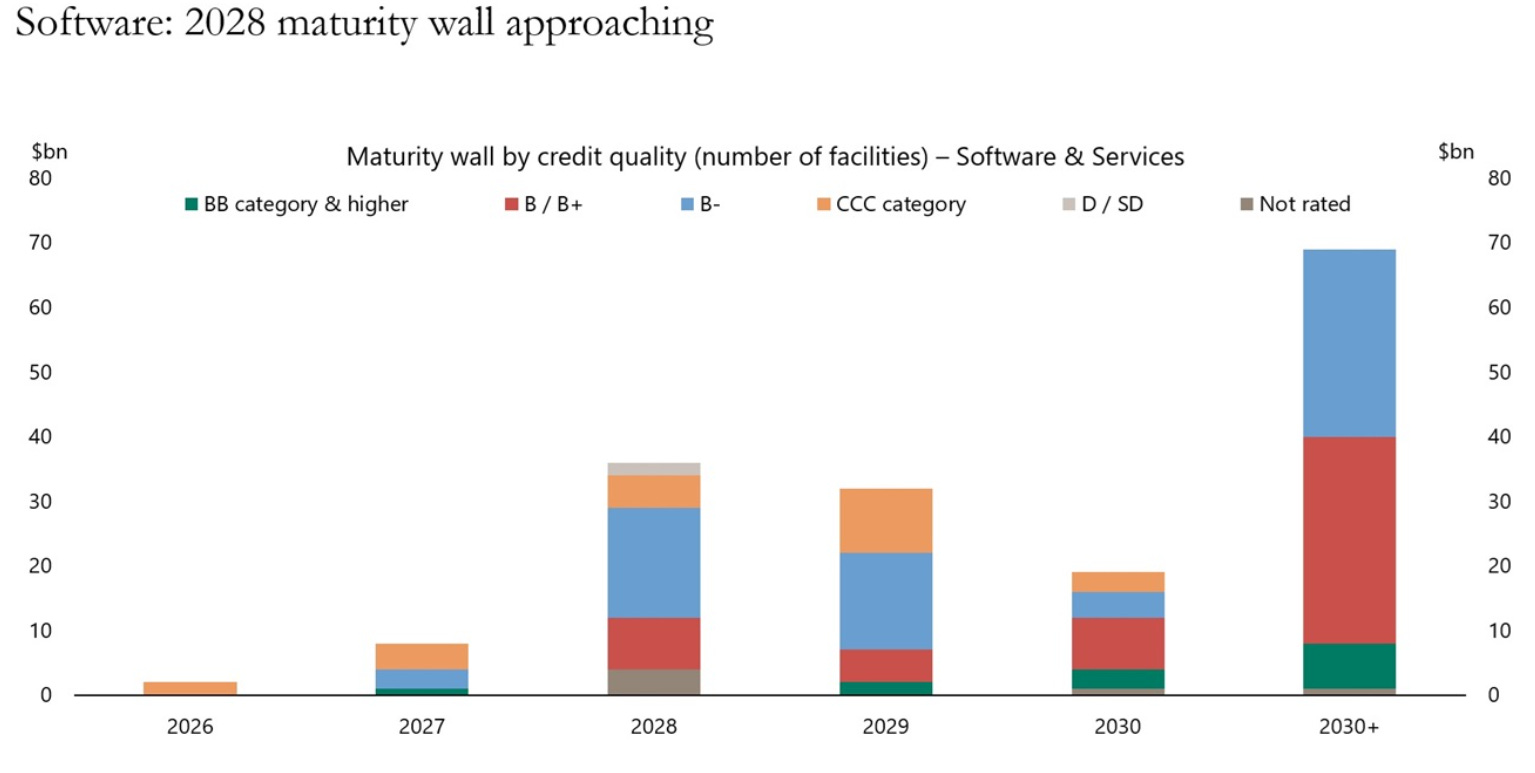 We’ve covered this multiple times now. The private credit boom in software lending peaked roughly 2021 to 2023 by most estimates. Sponsor-owned software businesses, many taken private at elevated multiples, borrowed heavily from direct lenders at spreads that reflected both the illiquidity premium and the credit risk the syndicated market didn’t want to absorb.