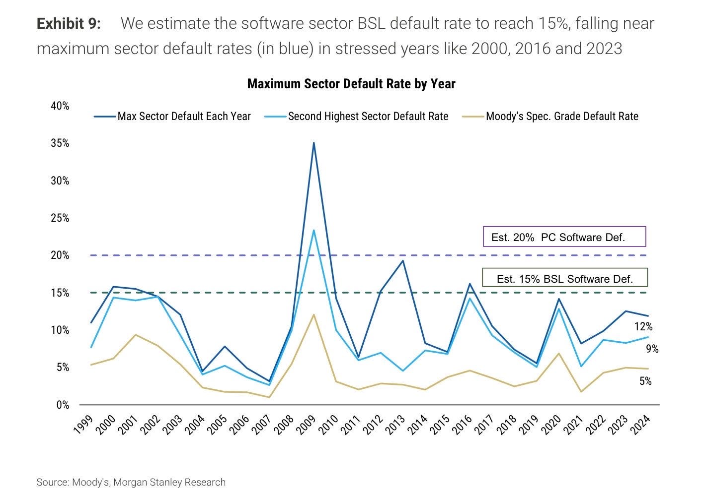And the default backdrop they’re maturing into is not benign. Morgan Stanley estimates the private credit default rate reaches 20% in the current cycle, approaching the sector’s historical stressed peak in 2009.