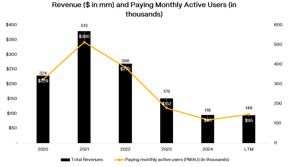 Now? It’s market cap sits at around $100 million, and shrinking. The boom turned into a bust, and the business hasn’t found the floor yet. Q2’25 revenue was $27 million, down roughly 80% from peak, and it’s not just fewer people playing…it’s that the ones still around are spending less. Paying users cratered from over 500,000 to just 146,000, and even those users are playing fewer games.