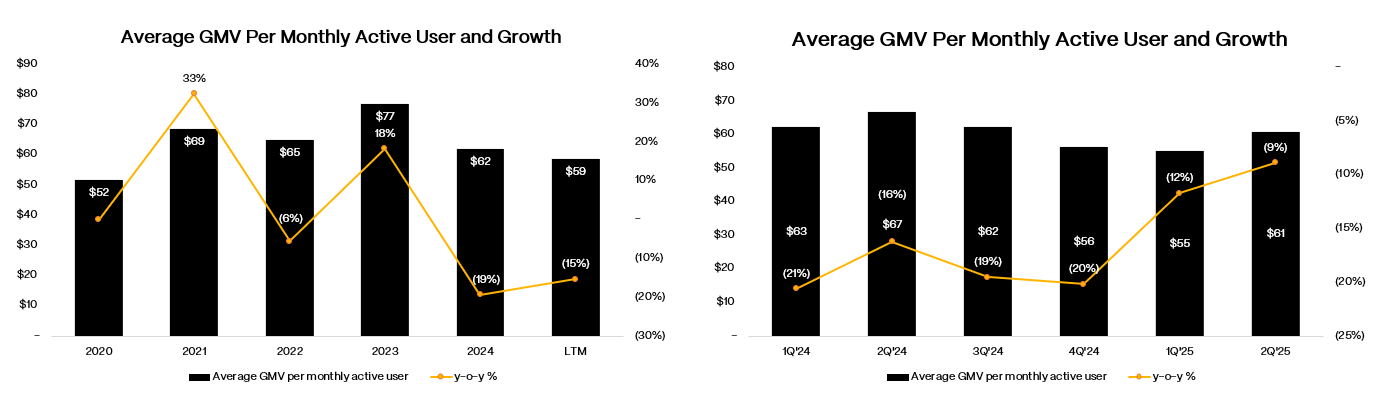 The more telling metrics show the same pattern. Average GMV per MAU continues to fall, signaling weaker engagement even among the core base.