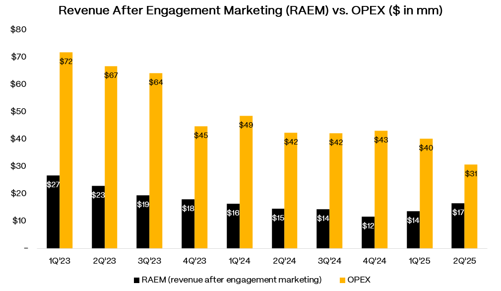 Revenue after engagement marketing (the number that actually matters once you strip out promos and prize pools) was just $17 million in 2Q’25, still not meaningful enought to cover overhead.