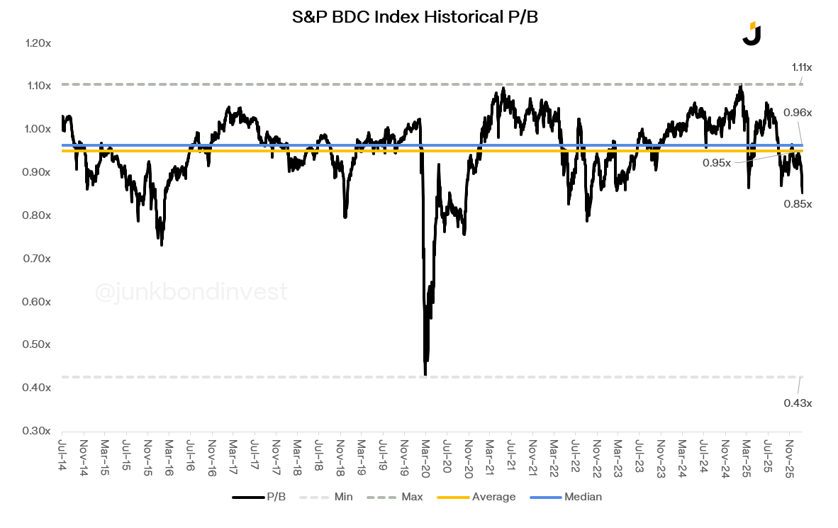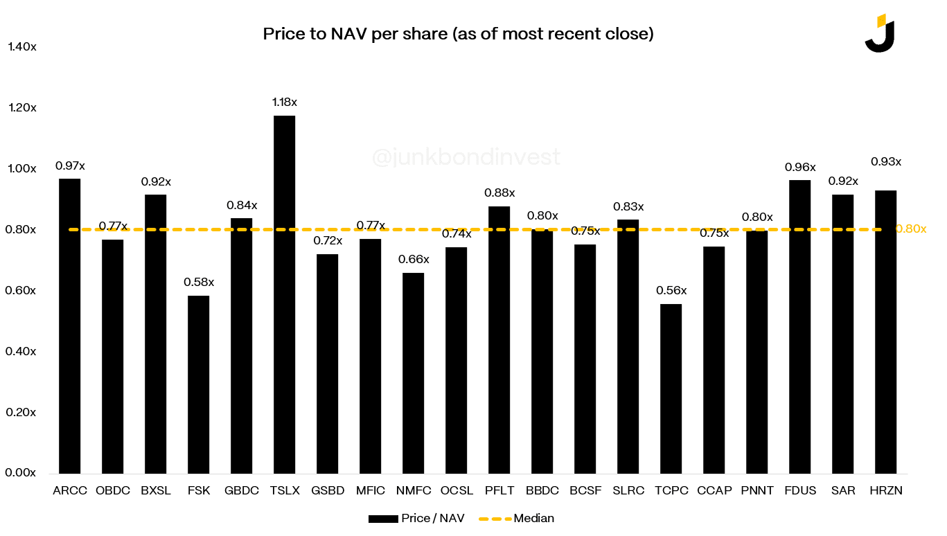 The stock prices reflect the anxiety. The sector trades below NAV, below the five-year average closer to par. Many individual names trade at 0.70x to 0.85x book.