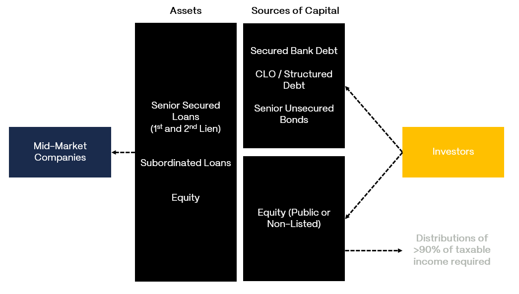 The borrowers are typically private equity-backed companies doing somewhere between $10 million and $250 million in annual cash flow. Too small to issue bonds in the public markets. Too large or too leveraged for a traditional bank to want to deal with. BDCs fill that gap.