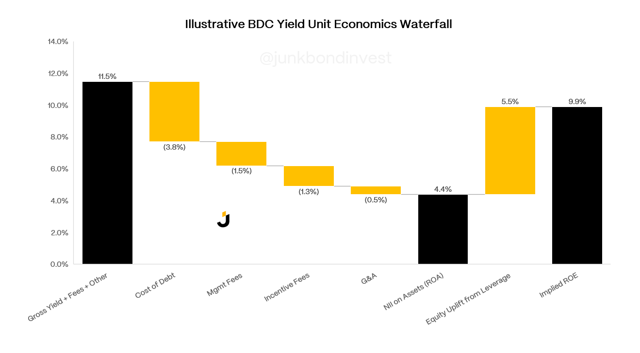 On the asset side, the typical BDC portfolio yields somewhere around 10-11%. On the liability side, the blended cost of funding is meaningfully lower because BDCs finance themselves with a mix of equity (no interest cost), unsecured bonds, and revolving credit facilities. The gap between what they earn and what they pay is the net investment spread, and it flows through to shareholders as dividends after operating expenses and fees.