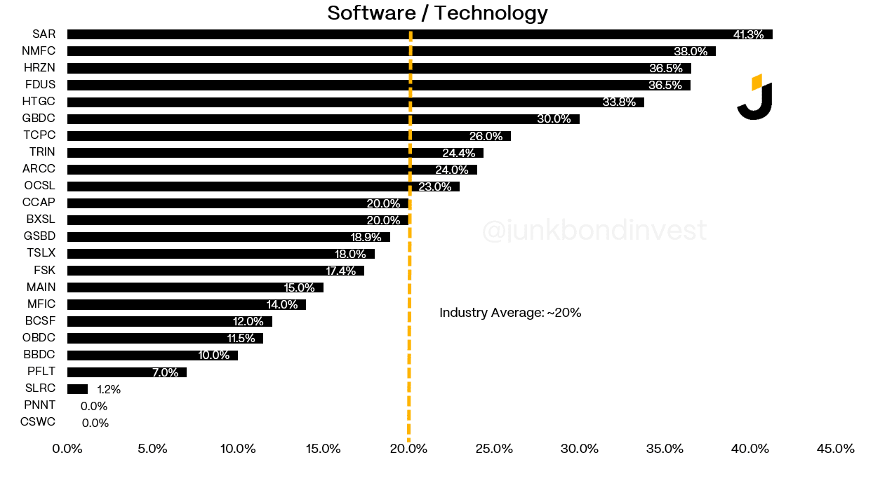 And the exposure isn’t evenly distributed. Some BDCs have 30%+ in software. Others are closer to 10-12%. If anything, these figures understate reality. Managers have discretion over how they classify credits, and plenty of software-adjacent deals end up labeled “business services” or “healthcare IT.” When you see a name trading at a wider discount than peers, check the software allocation before assuming the market is wrong.