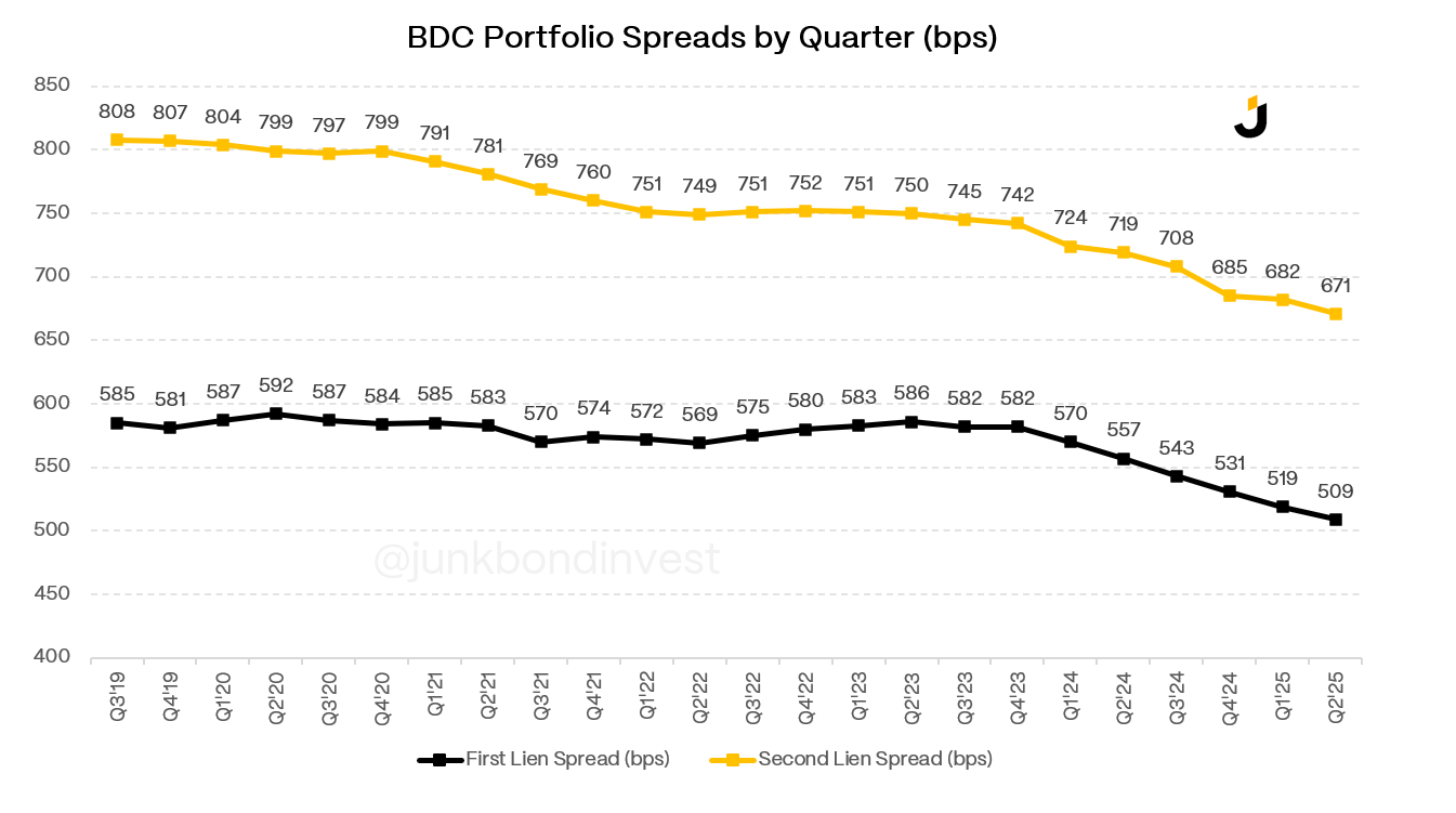 Competition is squeezing the business from the other direction. Spreads on new originations are near trough levels. The broadly syndicated loan market has gotten aggressive on pricing and is winning deals that would’ve gone to direct lenders a year ago. In December 2025, the OCC and FDIC formally withdrew from the 2013 leveraged lending guidance and 2014 FAQs, which could bring banks back into middle market lending more aggressively. And it’s not just new originations. BDCs are also seeing their existing back-books get refinanced at tighter spreads as borrowers take advantage of the competitive environment to reprice their debt.