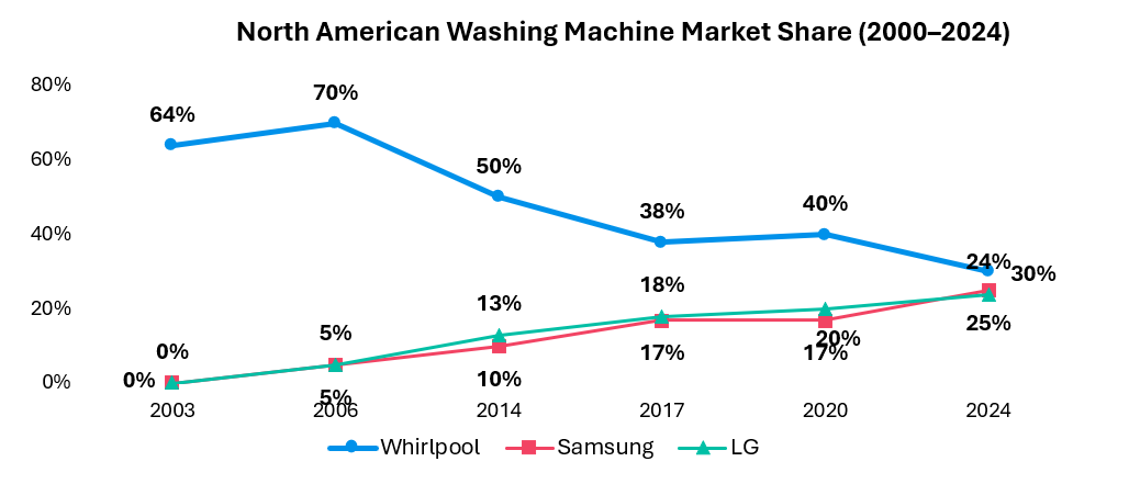 Then came the Korean invasion. Samsung and LG arrived as supposed “cheap imports” but were actually massive conglomerates with deep pockets and semiconductor expertise. While Whirlpool optimized factory floors, Samsung was reimagining what an appliance could be. Their North American market share dropped from dominance to competitive by 2024. Margins compressed from double digits to mid-single digits as promotional activity became permanent.