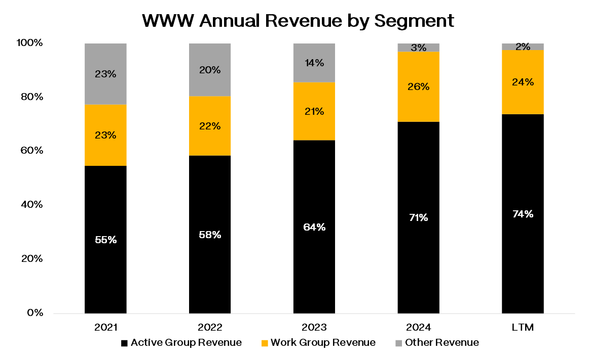 WWW reports in three segments: Active ($1.37bn LTM), which houses Merrell and Saucony; Work ($439mm), built around the Wolverine boot franchise selling into industrial and safety channels; and Other brands/licenses ($46mm). There’s also Sweaty Betty, an athleisure apparel business tucked into Active that the company is still figuring out what to do with.