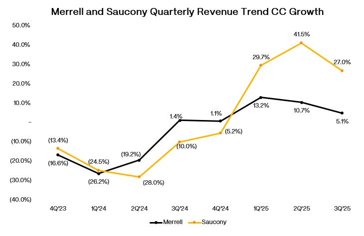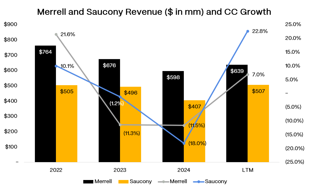 What remains is a $1.85bn business where Merrell and Saucony generate $1bn+ in revenue and most of the gross profit. Merrell has returned to mid-to-high single digit growth.
