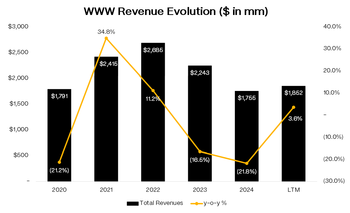 Two years ago this was a different company. Management ran a “house of brands” strategy that included Sperry, Keds, Hush Puppies, Wolverine Leathers, and a bunch of kids formats. All of it is gone now. These were structurally low-return businesses, over-indexed to dying U.S. department stores or too small to justify management attention. The proceeds went to debt paydown and inventory cleanup. Revenue dropped from $2.68bn in FY’22 to $1.75bn in FY’24. That was the plan.