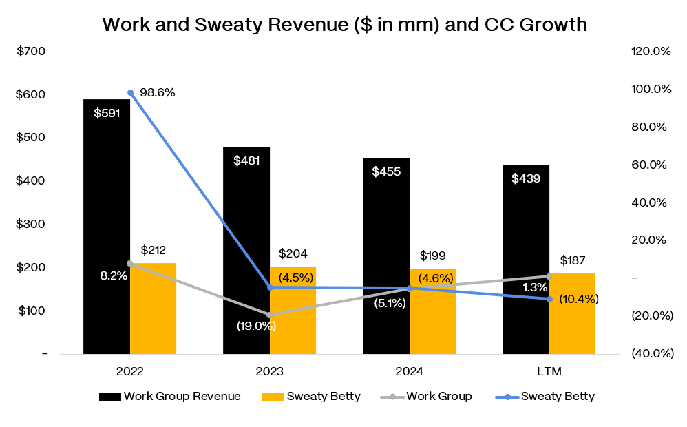 Management is already pruning underperformers and expects door growth to slow in 1H’26, but brand momentum is strong. Work is guided down high-single digits in FY’25. Sweaty Betty is comping negative as weaker U.S. locations close and focus shifts back to EMEA. Nobody is pretending these are growth engines.