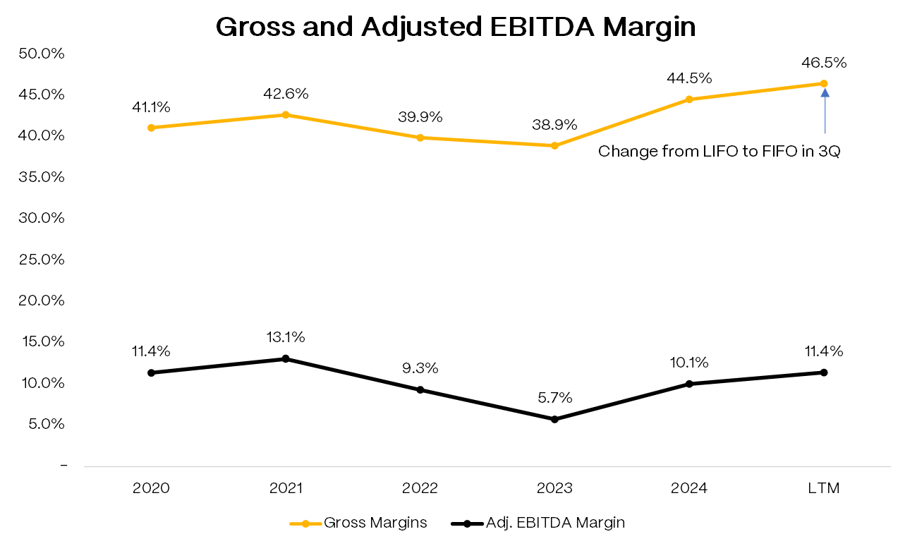 Margins have recovered sharply from the FY’23 trough. Gross margins bottomed at 39%, recovered to 45% in FY’24, and are running at 47% in FY’25 YTD. Mix shift toward Active, lower promotions, and product cost savings drove most of it. A 3Q’25 switch from LIFO to FIFO on certain U.S. inventory inflates the headline number somewhat, but the underlying improvement is real. EBITDA margins have moved from mid-singles to roughly 10% on FY’25 guidance. Management’s long-term framework calls for 45-47% GMs, mid-teens EBIT, and $150mm+ operating cash flow. They’re not there yet.