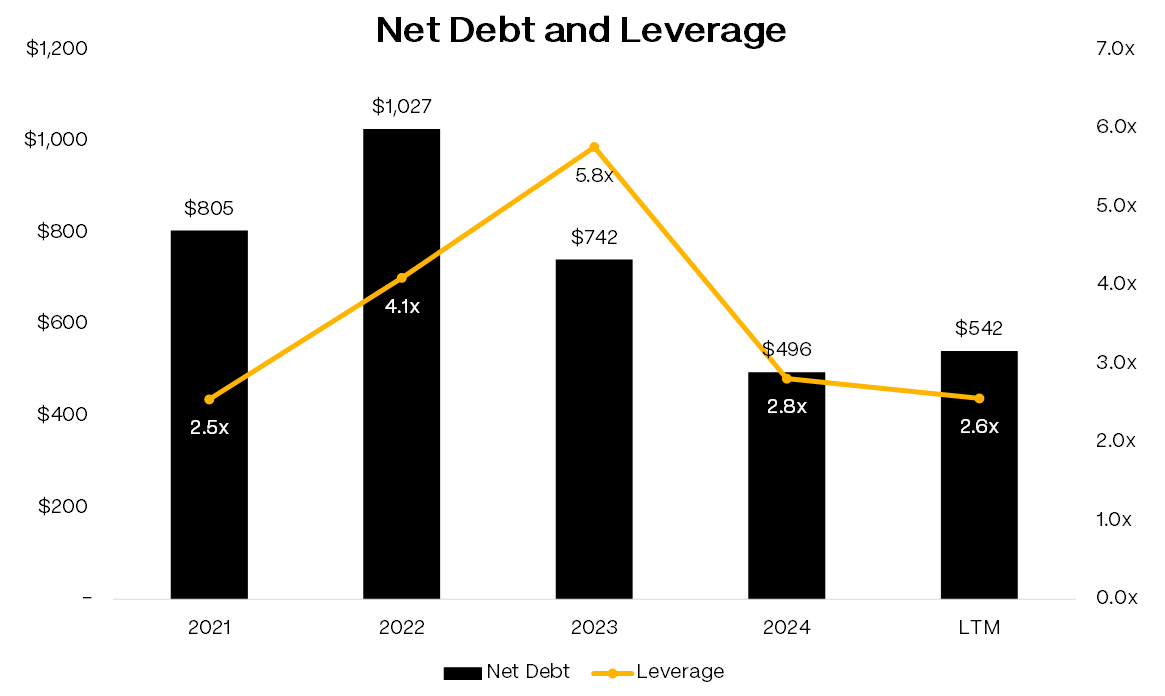 At 3Q’25 the company had $680mm total debt, $134mm cash, and $212mm of LTM EBITDA. That works out to 3.2x total leverage, 2.6x net, and mid-single digit interest coverage.