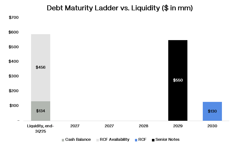 The capital structure is simple comprising $550mm in 4.00% senior unsecured notes due August 2029 and a $600mm secured revolver maturing September 2030 ($456mm currently undrawn). No term loans, no other bond tranches, nothing else to refinance before the 2029s come due.